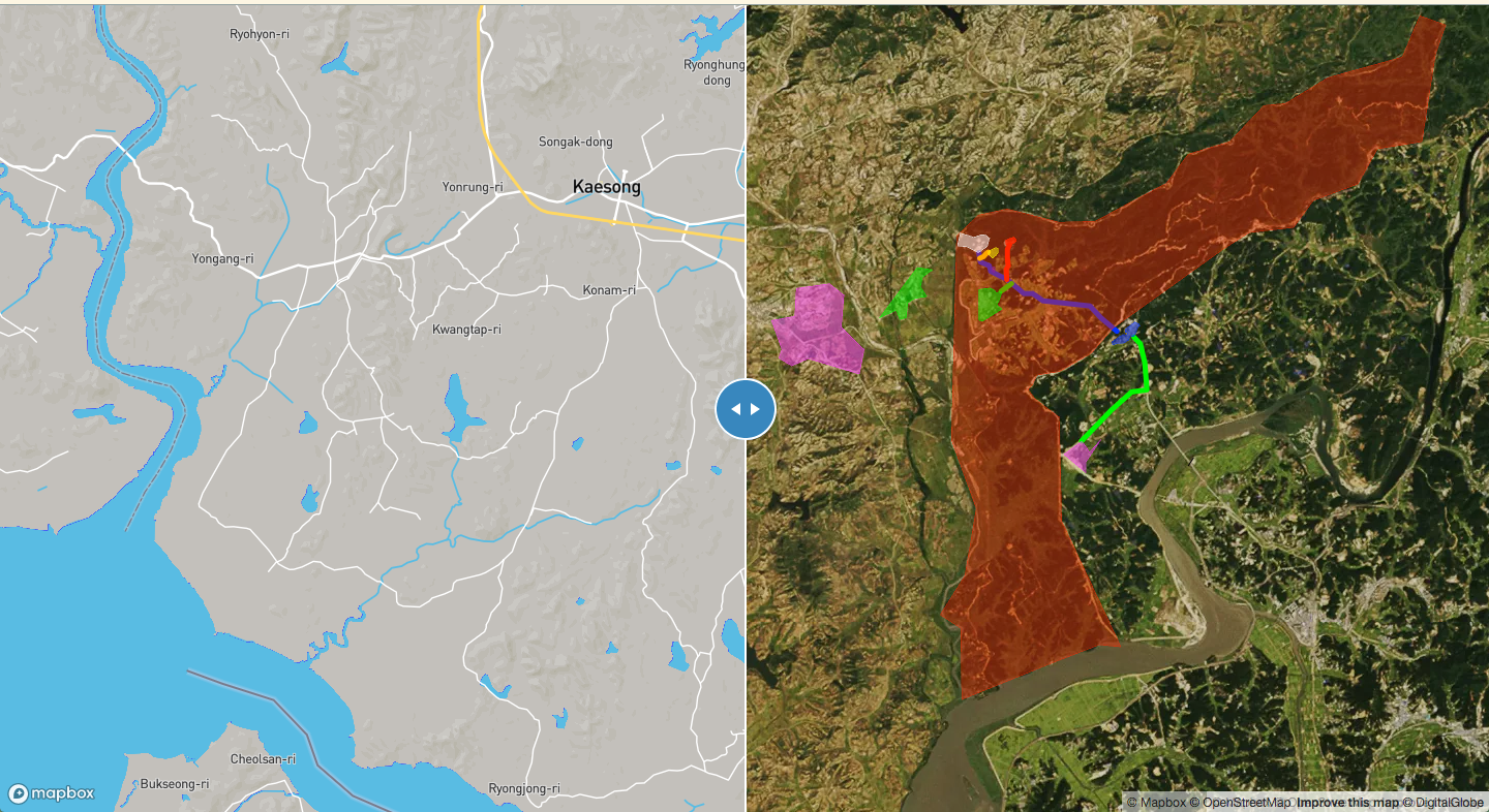 I decided to make my own map of this area, since I spent 2 years serving in the ROK Army under United Nations Command Security Battalion - JSA prior to coming to Olin for college education. You can find my version of the map here. I used geojson.io to indicate some interesting areas and routes. Then I used Mapbox GL JS and its Compare plugin to put an ordinary map and a satelite map next to each other. Here is a short legend for the map (which I couldn’t figure out how to display with Mapbox GL JS)
